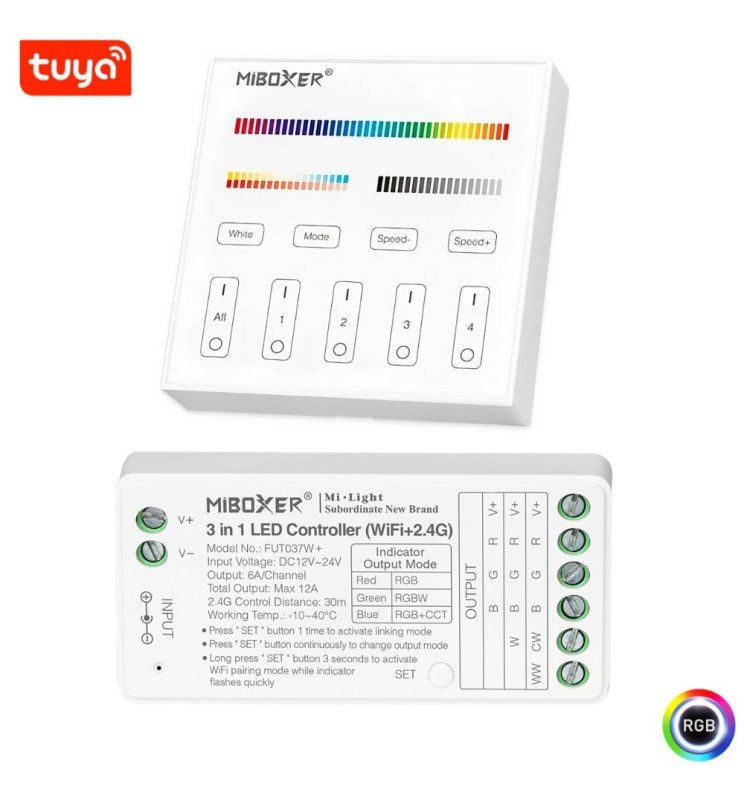 Referencia: SLPACK-FUT037W+B4 El Pack Controladora LED WiFi 3 en 1 + Panel de Control Remoto 2.4GHz ofrece máxima versatilidad y comodidad. Controla tus tiras LED en RGB, RGBW y RGB+CCT desde la App Tuya Smart o con el panel de pared magnético sin tornillos. Ajusta brillo, color, velocidad y efectos dinámicos con facilidad, disfruta de animaciones inteligentes y personaliza píxeles para lograr una iluminación única. Instalación rápida y alcance de hasta 30m para un control total.
