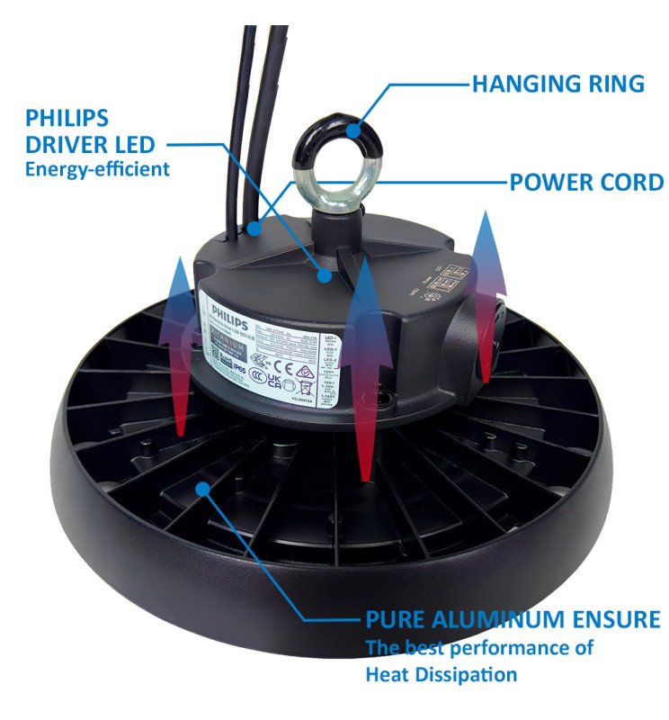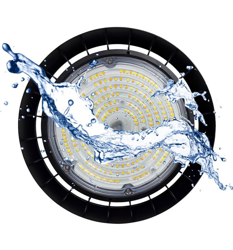 la campana está fabricada con materiales resistentes y cuenta con certificación ip65, lo que la hace totalmente protegida contra el polvo y los chorros de agua. es perfecta para su uso en fábricas, almacenes, centros logísticos, talleres, hangares o aeropuertos, incluso en condiciones adversas de humedad o partículas en el aire. su diseño compacto tipo ufo facilita la instalación y reduce el mantenimiento.