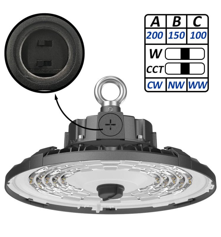 Una de sus características más destacadas es la potencia regulable, que permite seleccionar entre 200W150W, 100W, adaptándose perfectamente a las necesidades lumínicas de cada zona. Esta flexibilidad garantiza un uso eficiente de la energía, optimizando la iluminación en áreas de trabajo intensivo o en zonas donde se requiere un ambiente más suave y controlado.