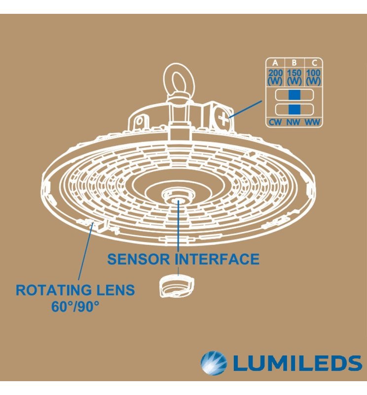Campana Industrial LED 200W/150W/100W Select | UFO FRANCE  3CCT | SMD2835 Lumileds 200Lm/W | Zhaga Plug And Play | Driver Sosen Dimable 1-10V | Ángulo 60º-90º
