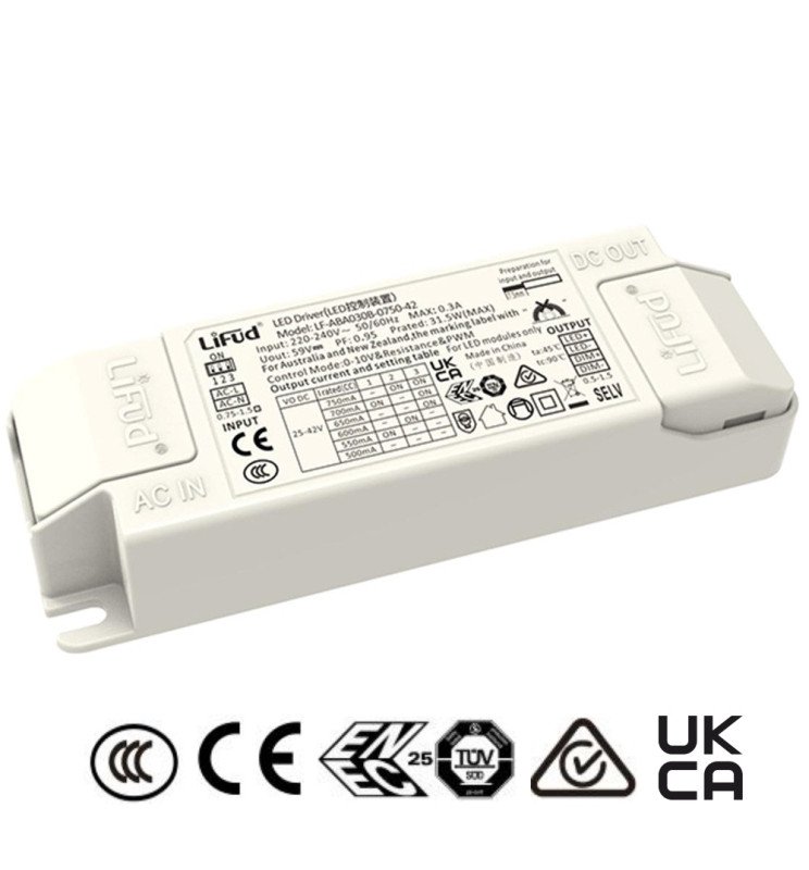Driver LIFUD Regulable 0-10V para LED hasta 30W, Optimiza tus luminarias con este driver sin flicker, ideal para Downlights, Placas y Plafones LED. Con entrada AC220-240V y salida regulable DC25-42V (500-750mA), ofrece un rendimiento estable y compatible con múltiples aplicaciones gracias a su diseño sin conectores de salida.