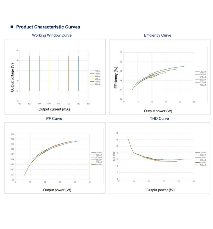 Una de sus grandes ventajas es que cuenta con salida multitensión: puede entregar una tensión constante dentro de un rango de 25 a 42V DC, adaptándose automáticamente a la carga conectada. Esto significa que el driver es capaz de operar con diferentes configuraciones de corriente (de 500 a 750 mA), haciendo que un solo modelo sea apto para una variedad de aplicaciones. Una vez alimentado, el sistema ajusta la salida de forma automática y mantiene constante la tensión dentro del rango especificado.
