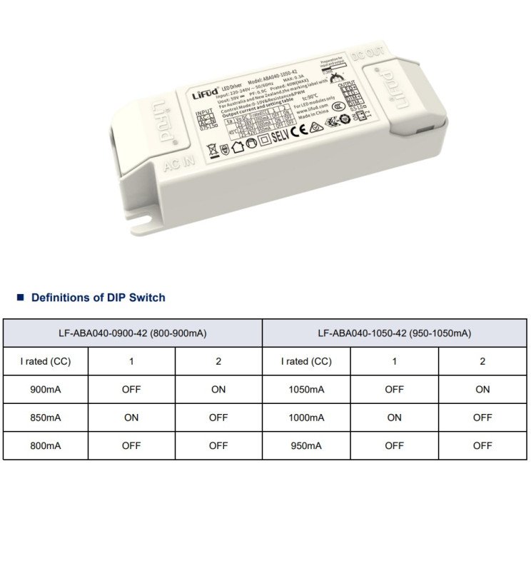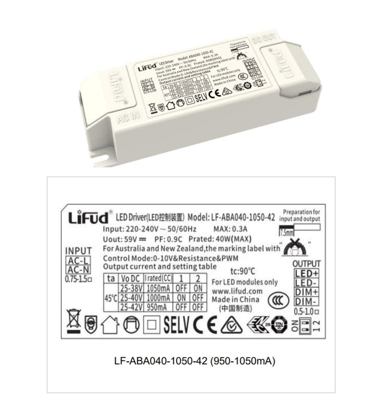Driver Lifud – Dimable 0-10V – Para luminarias LED de hasta 40W – No Flick – Salida 25-42V DC 800-1050mA LF-ABA040-1050