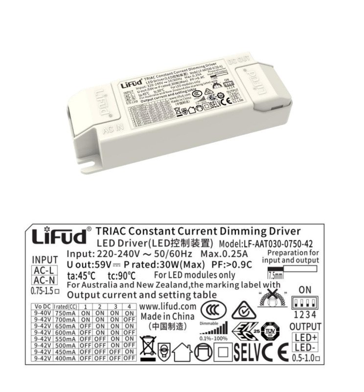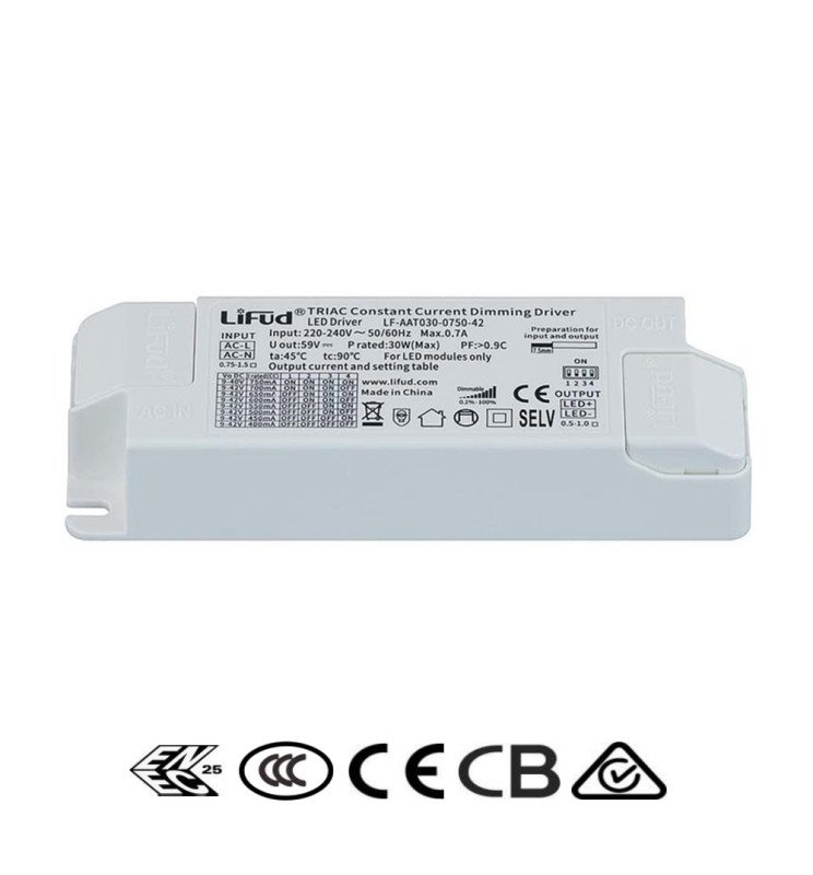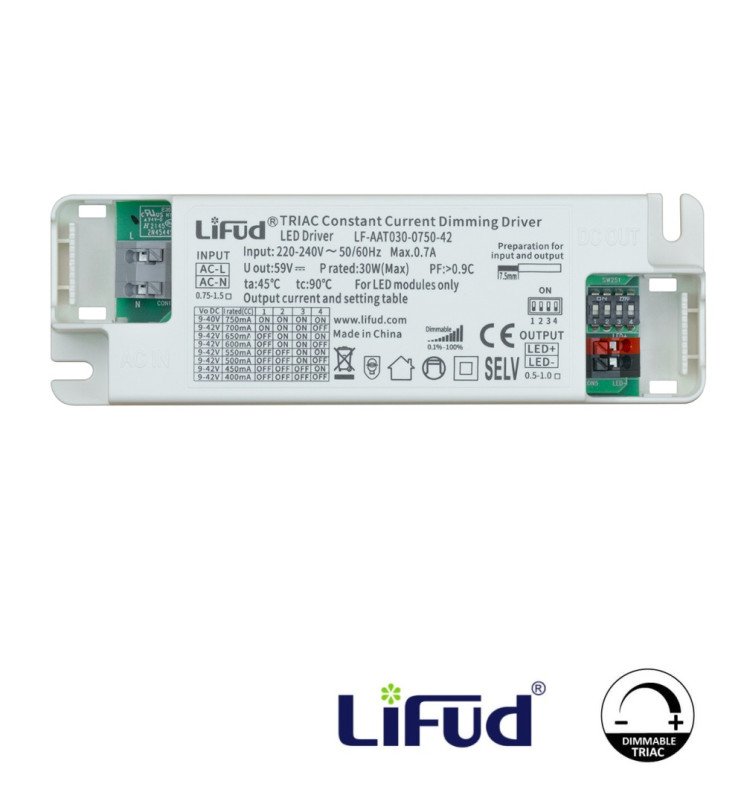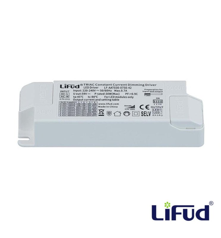 Driver Lifud – Dimable TRIAC – Para luminarias LED de hasta 30W – No Flick – Salida 09-42V DC 400-750mA