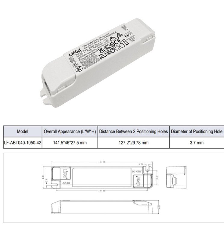 Driver LIFUD Regulable TRIAC  para LED hasta 40W, Optimiza tus luminarias con este driver sin flicker, ideal para Downlights, Paneles y Plafones LED. Con entrada AC220-240V y salida regulable DC25-42V (750-1050mA), ofrece un rendimiento estable y compatible con múltiples aplicaciones gracias a su diseño sin conectores de salida.