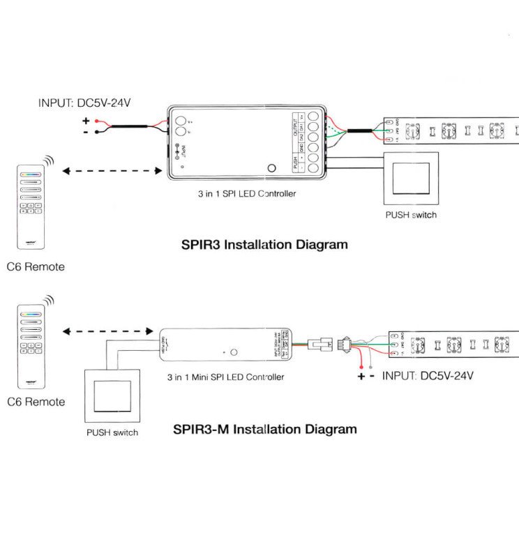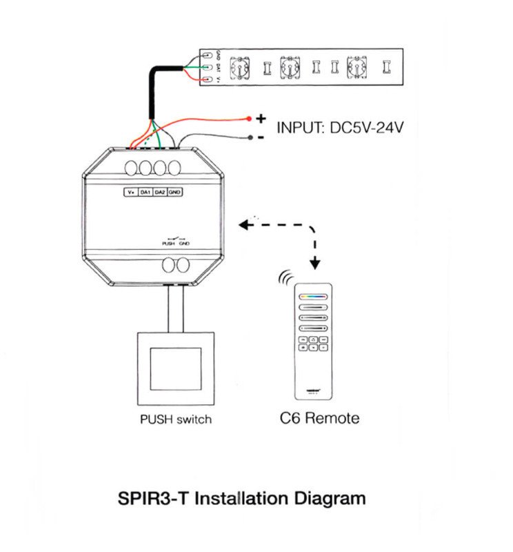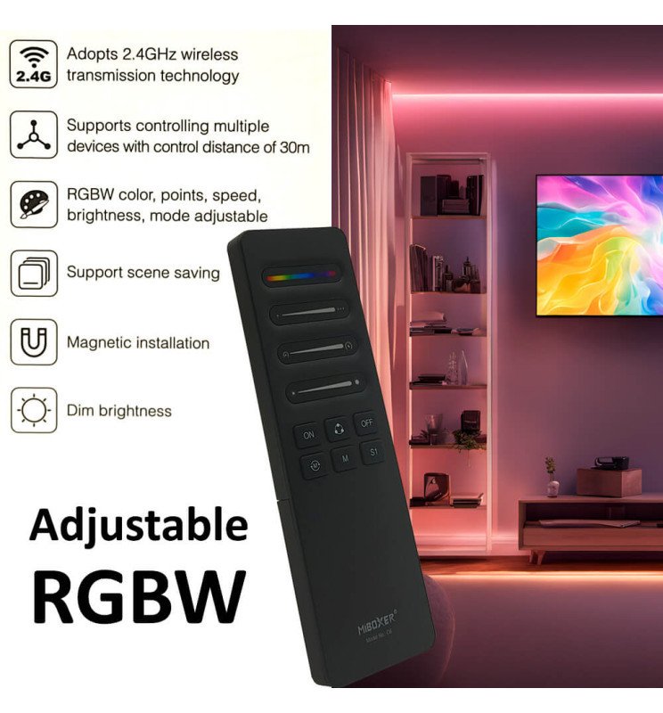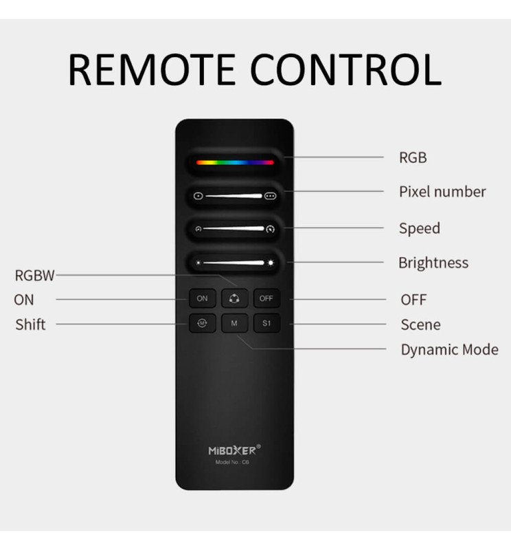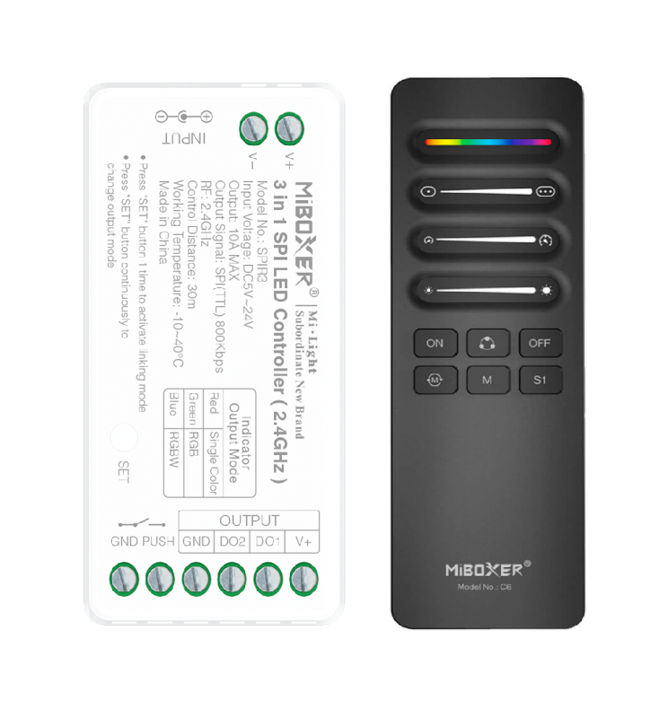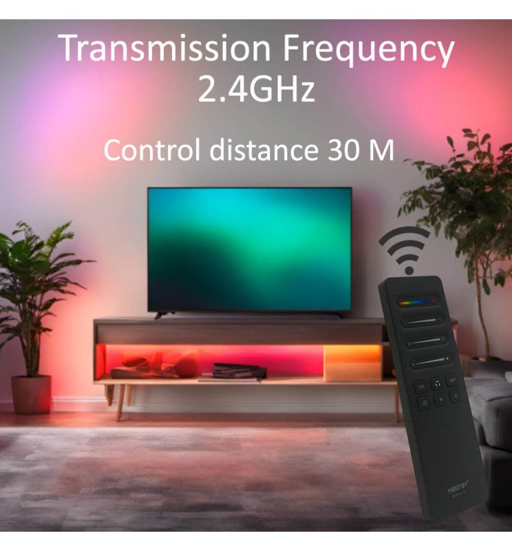 Tira de 5 metros con densidad de 360 diodos por metro, potencia de 9W/m, corte cada 5 cm y con cinta autoadhesiva para facilitar su instalación. Su tecnología COB RGBIC Digital ofrece una reproducción de color uniforme, sin puntos visibles, y permite crear efectos avanzados como degradados, animaciones dinámicas y sincronización con música. - Controladora LED SPI Digital MiBoxer 2.4GHz – PACK-SPIR3-C6