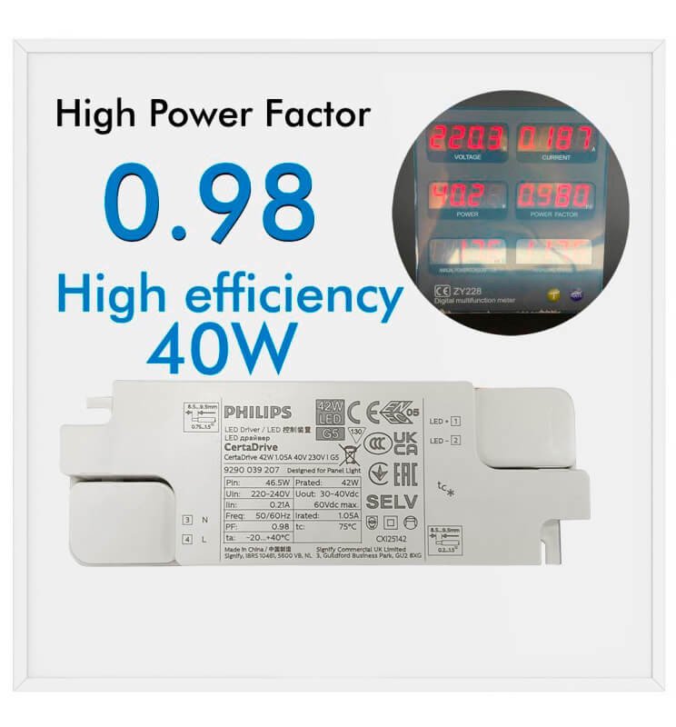 equipado con driver de alta gama, garantiza una iluminación estable, sin parpadeos molestos que causan fatiga visual. su alto factor de potencia (>0.97) asegura una eficiencia energética superior y una larga vida útil del sistema.