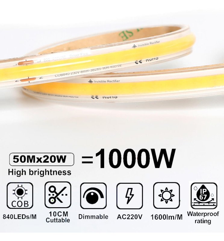 Tira LED COB 220V | 840 LED/m | 50m | FLIP CHIP | 1600Lm/M | 20W/M | CRI90 | IP67| Corte 10cm